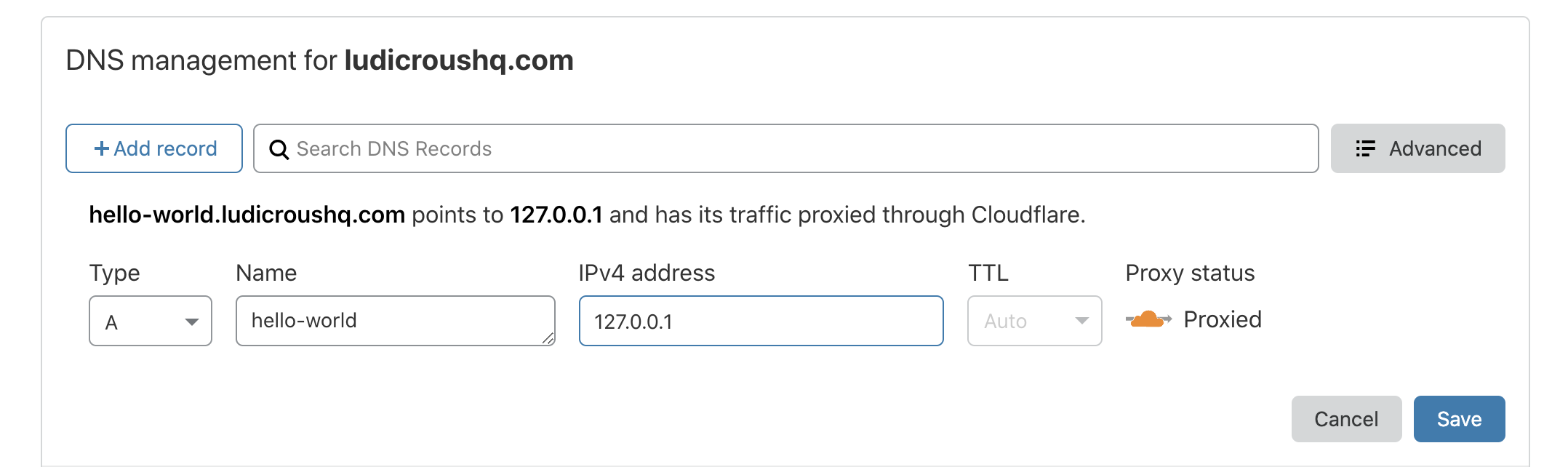 First thing's first, add your record to Cloudflare and point it where you need it to go. Make sure the orange cloud is on so that the traffic is proxied through Cloudflare.