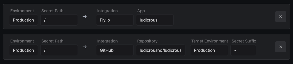 To get started, we set up Infisical, created our project, and added our production secrets. Then we set up the following syncs to Fly.io and GitHub actions: