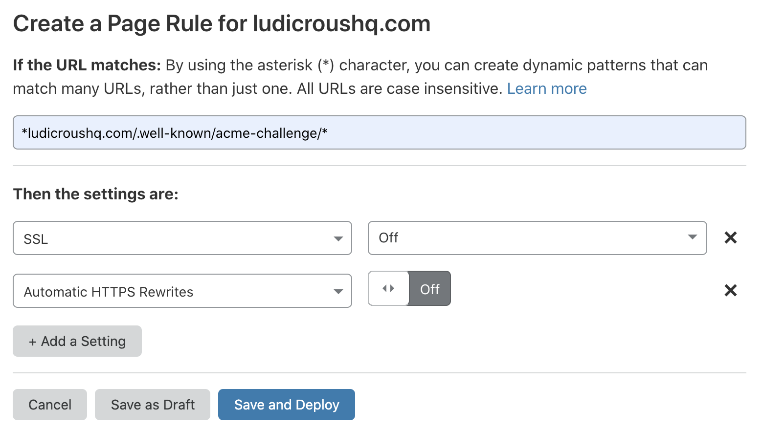 The URL should be *ludicroushq.com/.well-known/acme-challenge/*, but replace ludicroushq.com with your own domain. Make sure to turn SSL off, and Automatic HTTPS Rewrites off as well. Now when LetsEncrypt is trying to verify your domain, Cloudflare will not get in the way.